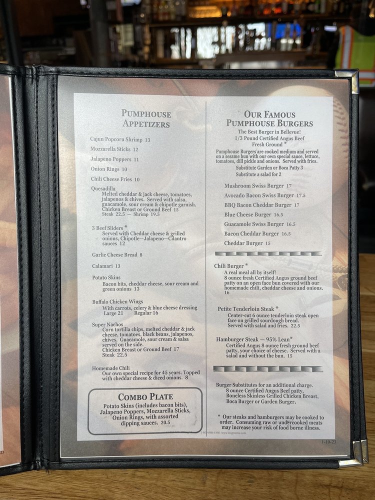 The Pumphouse Bar & Grill is a popular spot in Bellevue for a variety of reasons. Offering a range of American dishes, cocktails, and breakfast options, this restaurant caters to different tastes and preferences. With amenities like outdoor seating, wheelchair accessibility, and a full bar, it ensures a comfortable dining experience for all patrons. Customer reviews highlight the fantastic service, delicious food, and unique menu offerings, making it a go-to spot for many. Whether you're watching a sports game, grabbing a quick meal, or enjoying the weekend brunch menu, The Pumphouse Bar & Grill has something for everyone. The cozy ambiance, friendly staff, and diverse menu options truly make this restaurant a standout in the area.